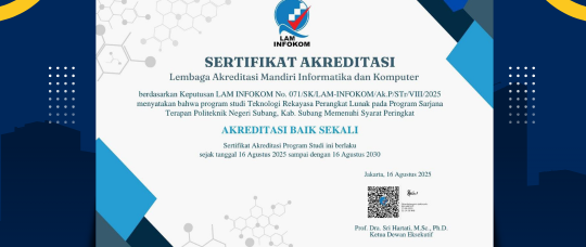 JTIK POLSUB — Program Studi D4 Teknologi Rekayasa Perangkat Lunak (TRPL) Jurusan Teknologi Informasi dan Komputer (JTIK) Politeknik Negeri Subang (Polsub) menorehkan prestasi gemilang dengan meraih akreditasi Baik Sekali. Capaian ini diumumkan secara resmi melalui Surat Keputusan (SK) LAM INFOKOM No. 071/SK/LAM.INFOKOM/Ak.P/STr/VIII/2025, sebuah pengakuan penting yang menegaskan komitmen Polsub dalam menyelenggarakan pendidikan tinggi berkualitas di bidang informatika dan komputer.